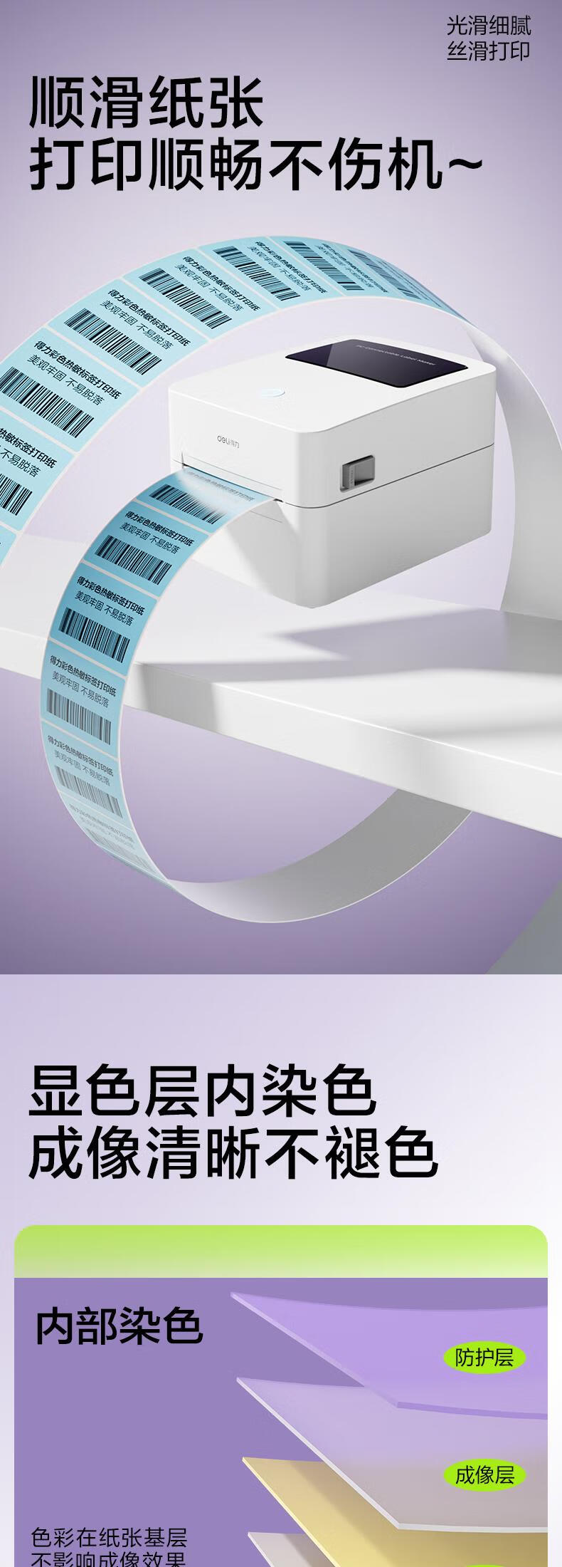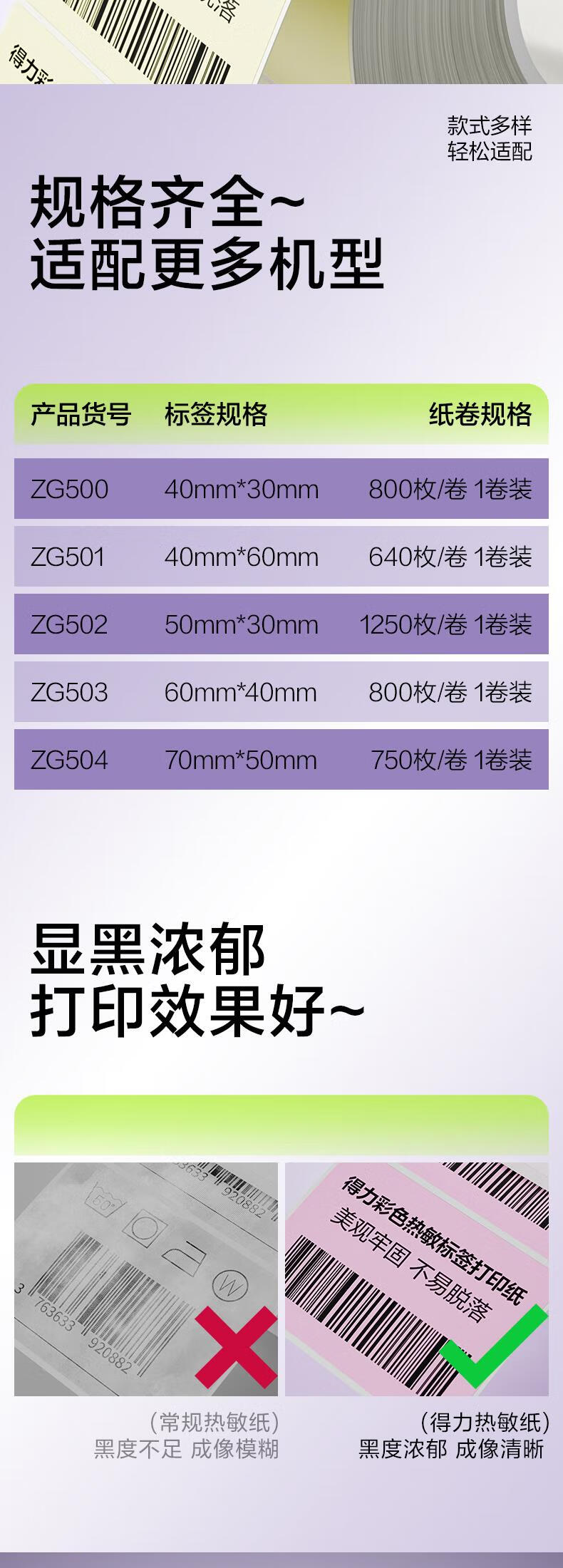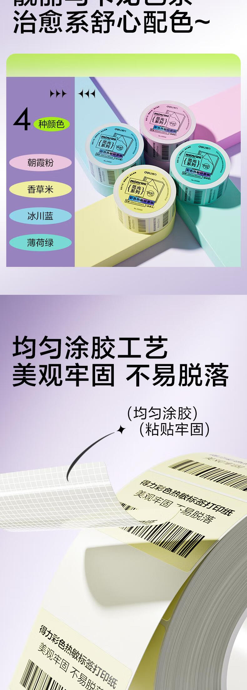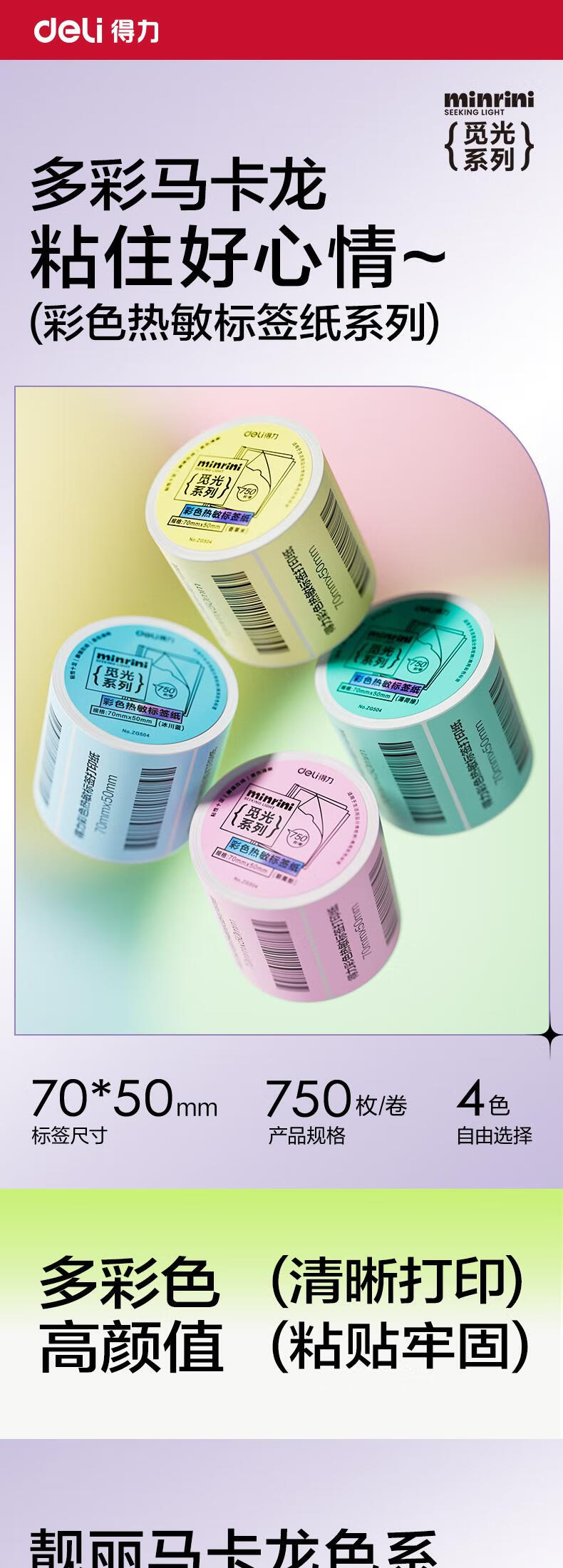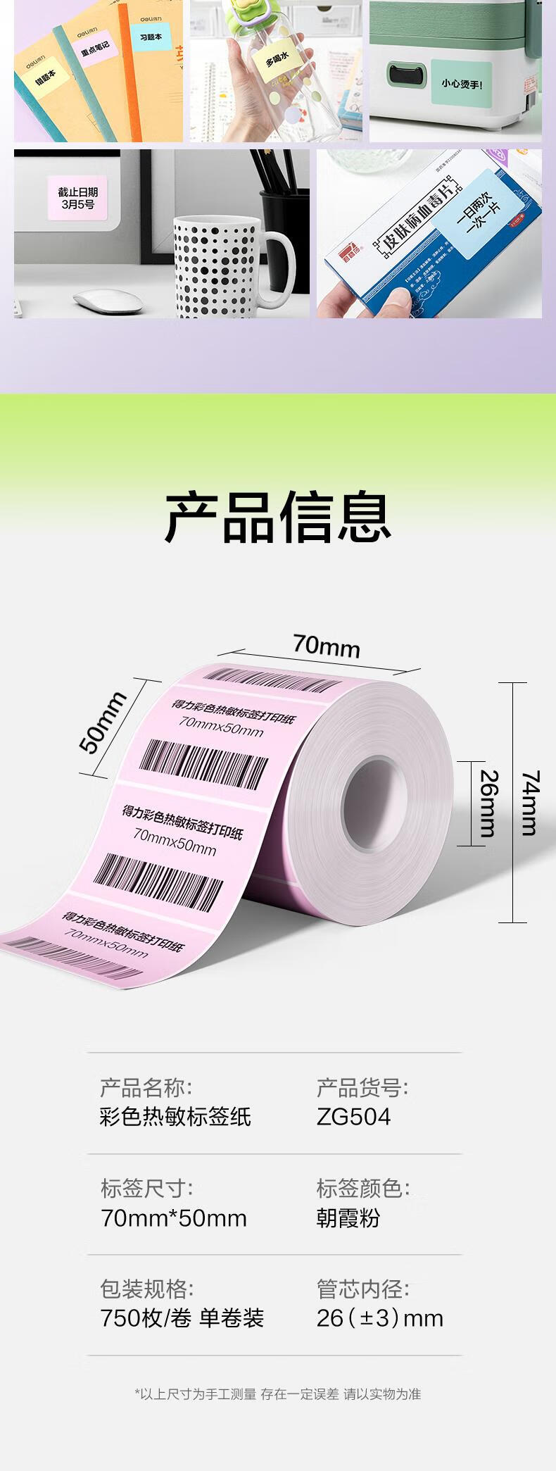 得力(deli)三防彩色热敏标签纸 70*50mm 750张*1卷 浅粉色热敏标签打印纸 食品服饰标签纸 ZG504