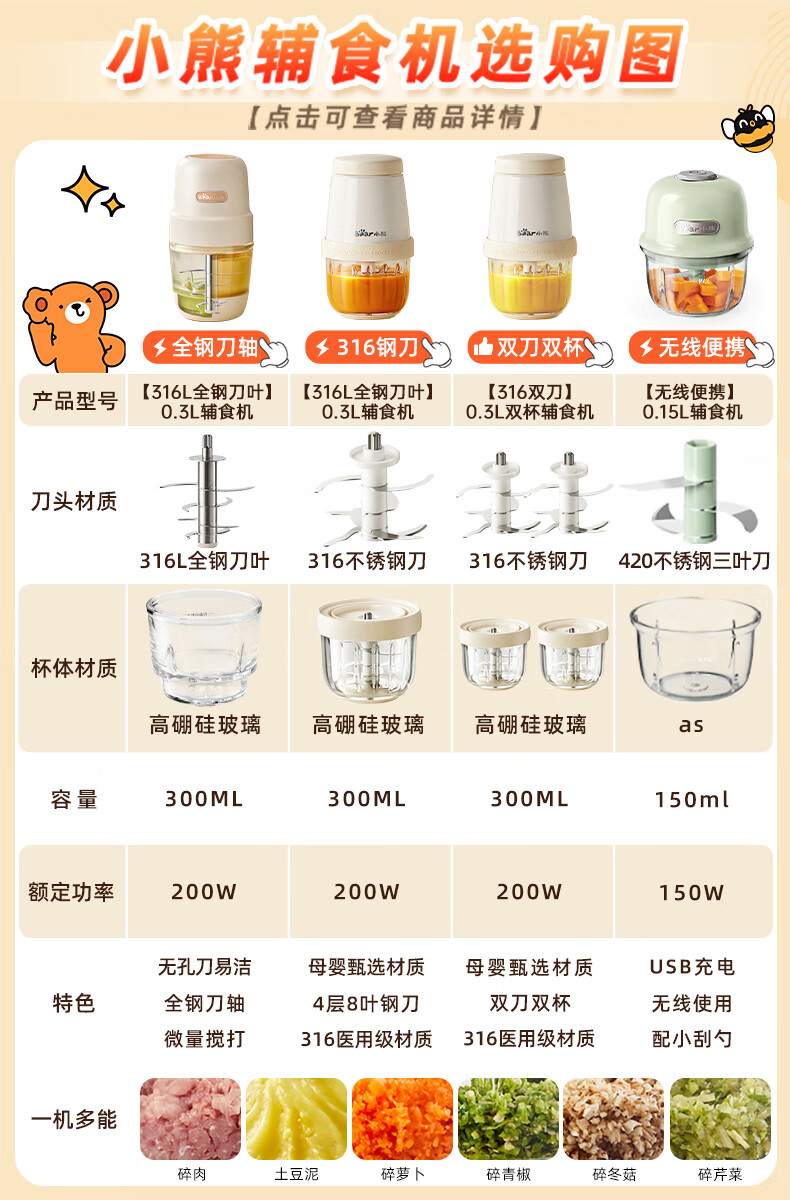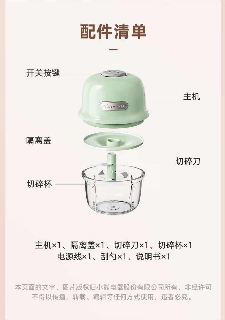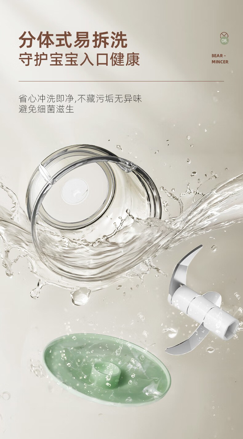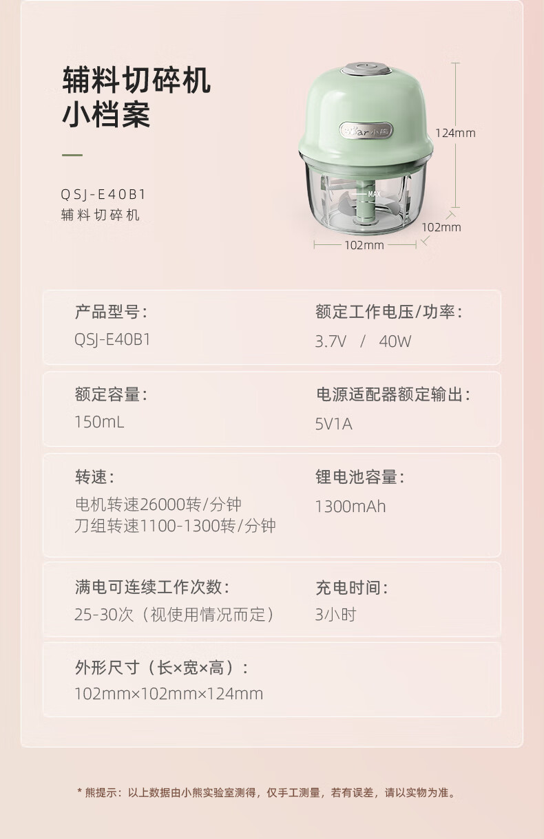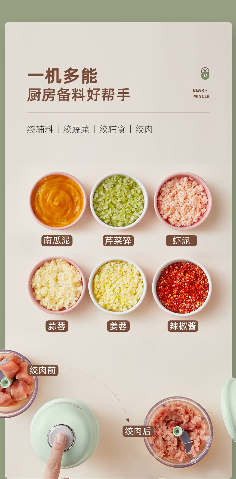 小熊(Bear)婴儿辅食机 绞肉机家用 小型多功能打泥搅拌机 宝宝辅食料理机蒜泥捣碎器 便携辅食机 QSJ-E40B1