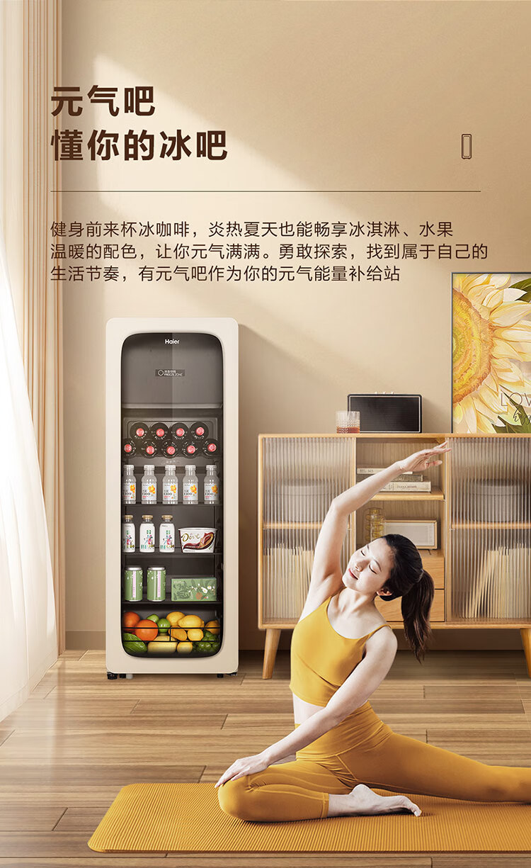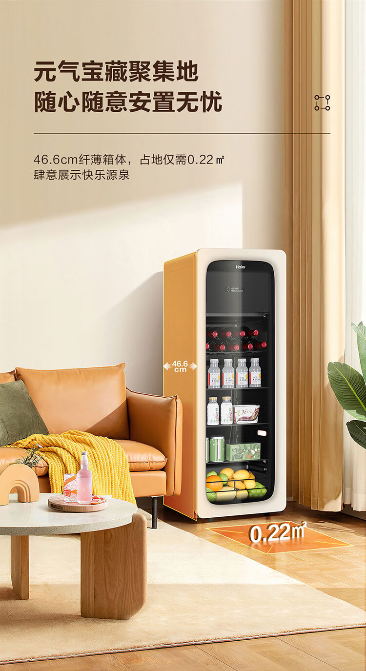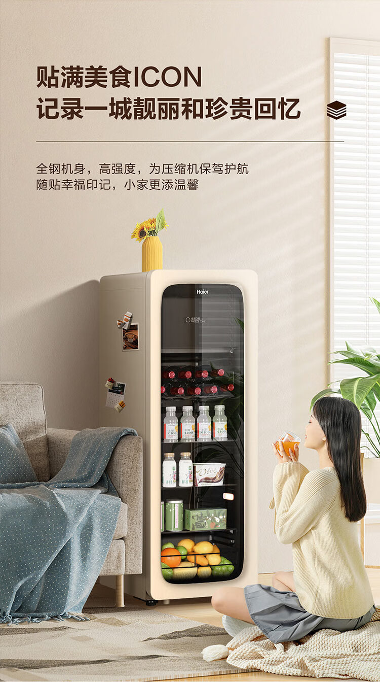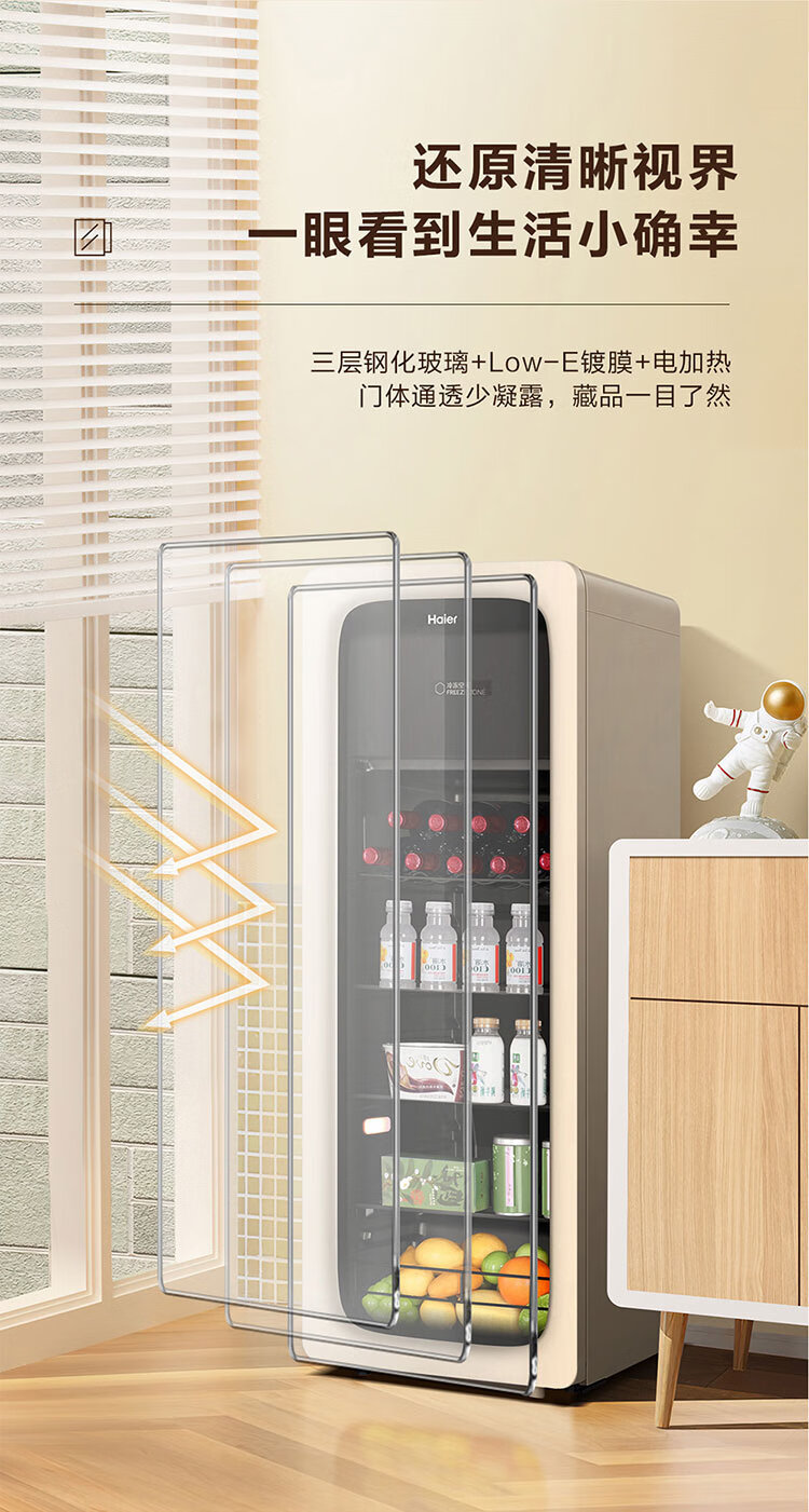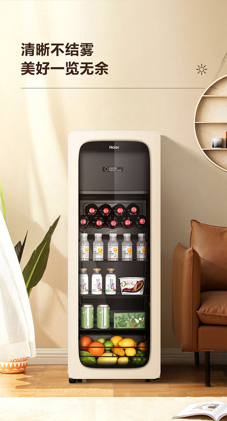 海尔(Haier)冰吧家用小型迷你冰箱客厅办公室卧室单门饮料茶叶水果红酒冷藏保鲜展示柜透明玻璃门超薄立式冰柜 92升全冷藏旗舰款丨风电子温控丨钢琴黑