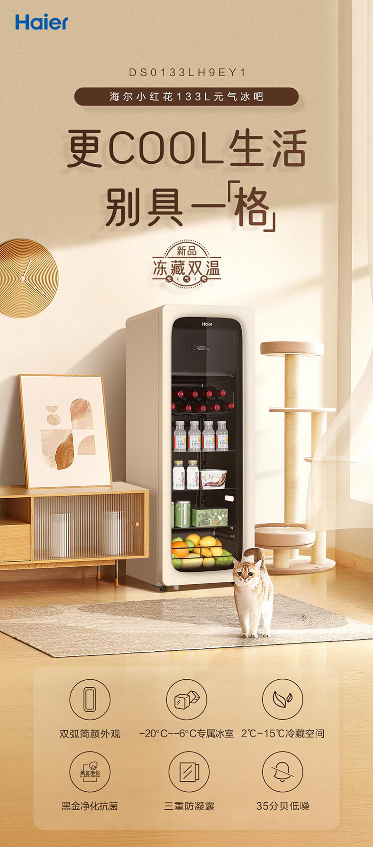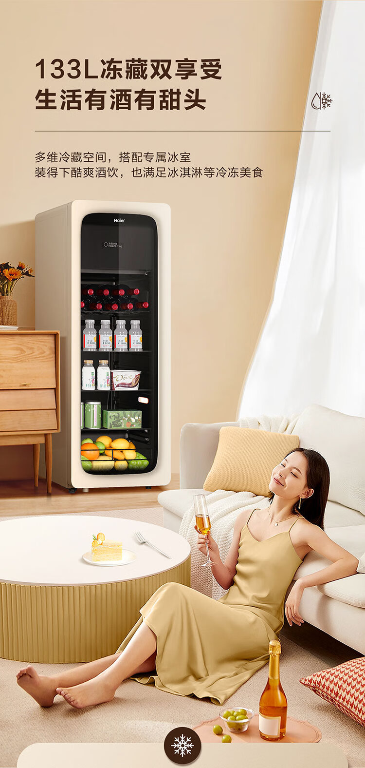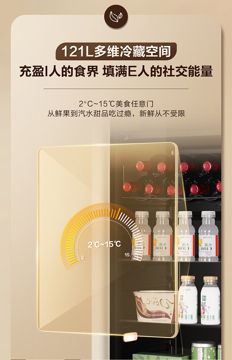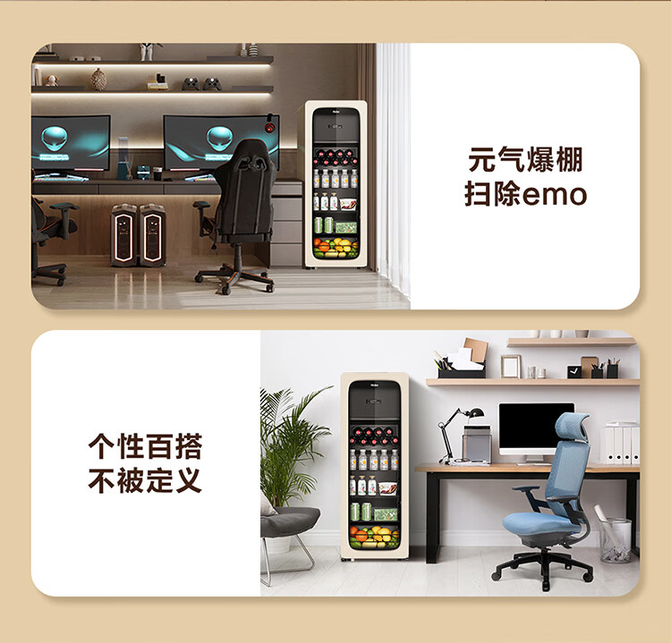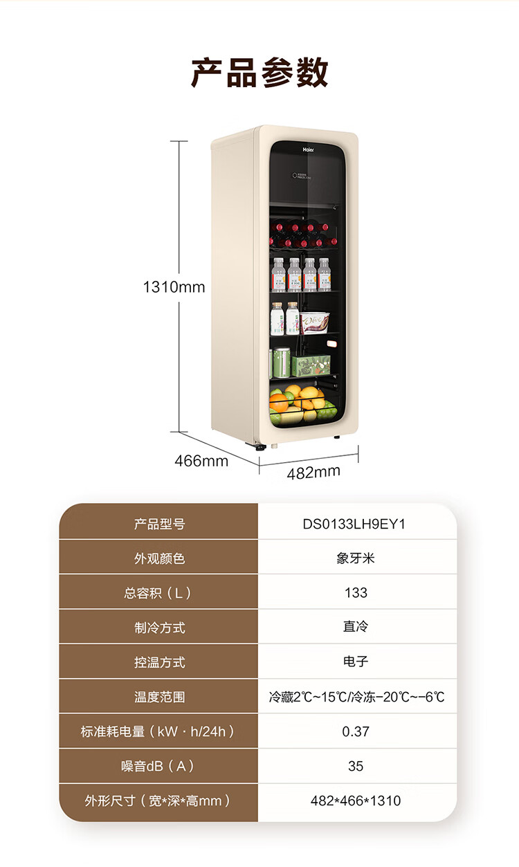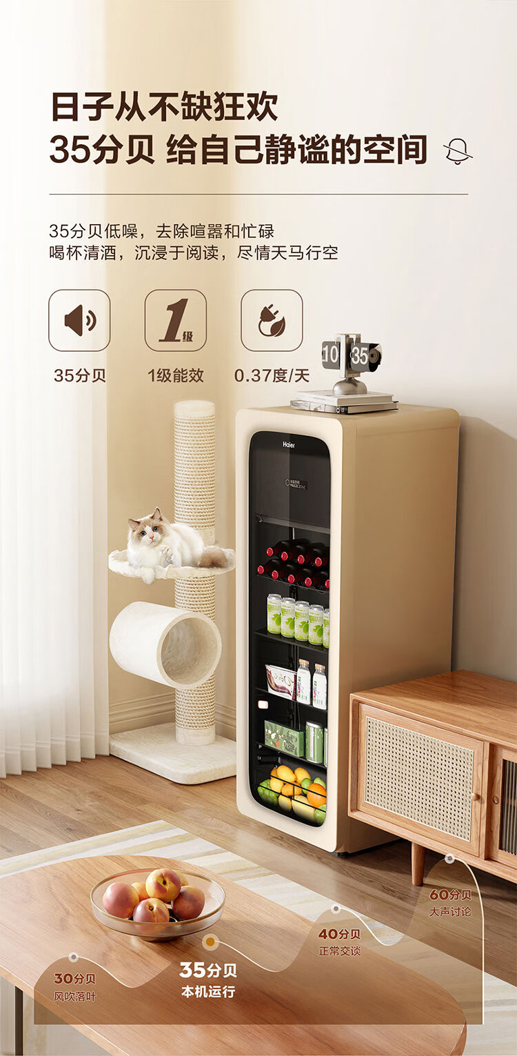海尔(Haier)冰吧家用小型迷你冰箱客厅办公室卧室单门饮料茶叶水果红酒冷藏保鲜展示柜透明玻璃门超薄立式冰柜 92升全冷藏旗舰款丨风电子温控丨钢琴黑