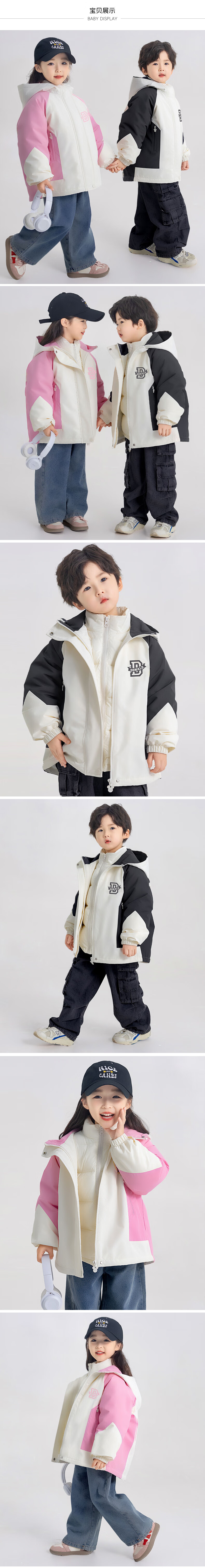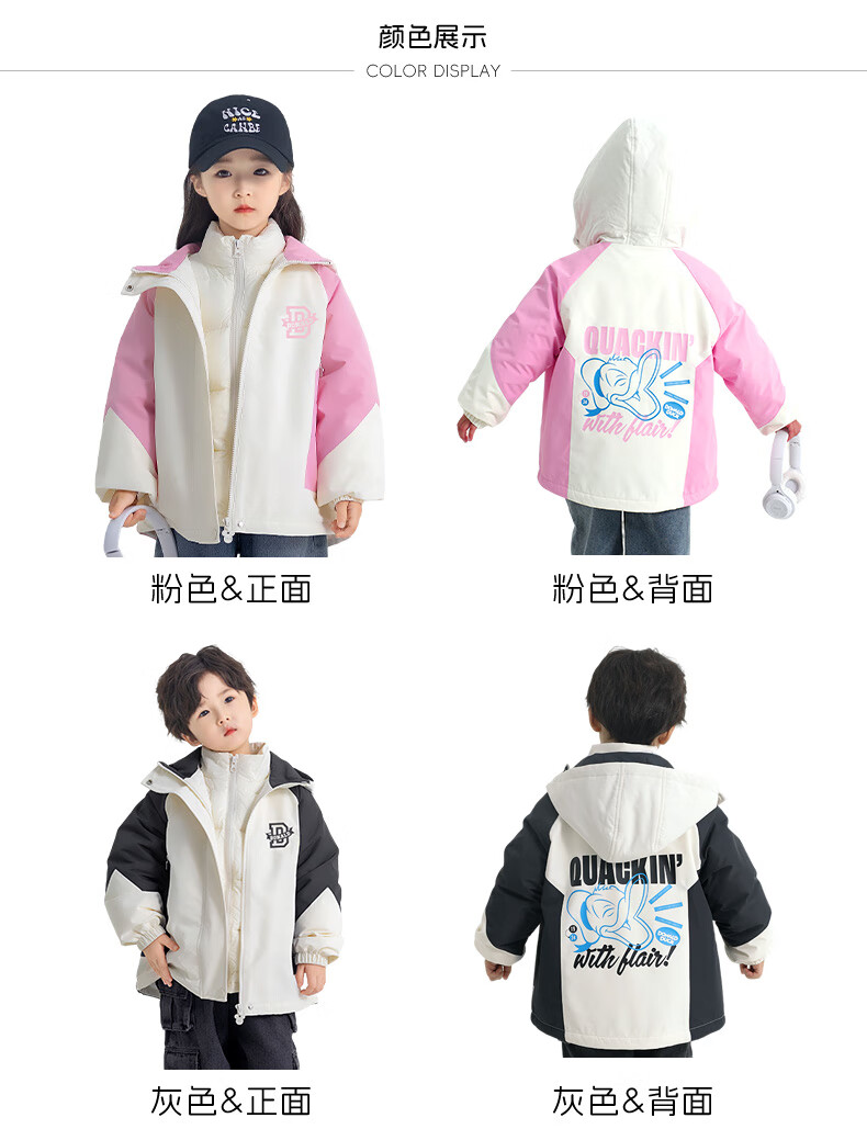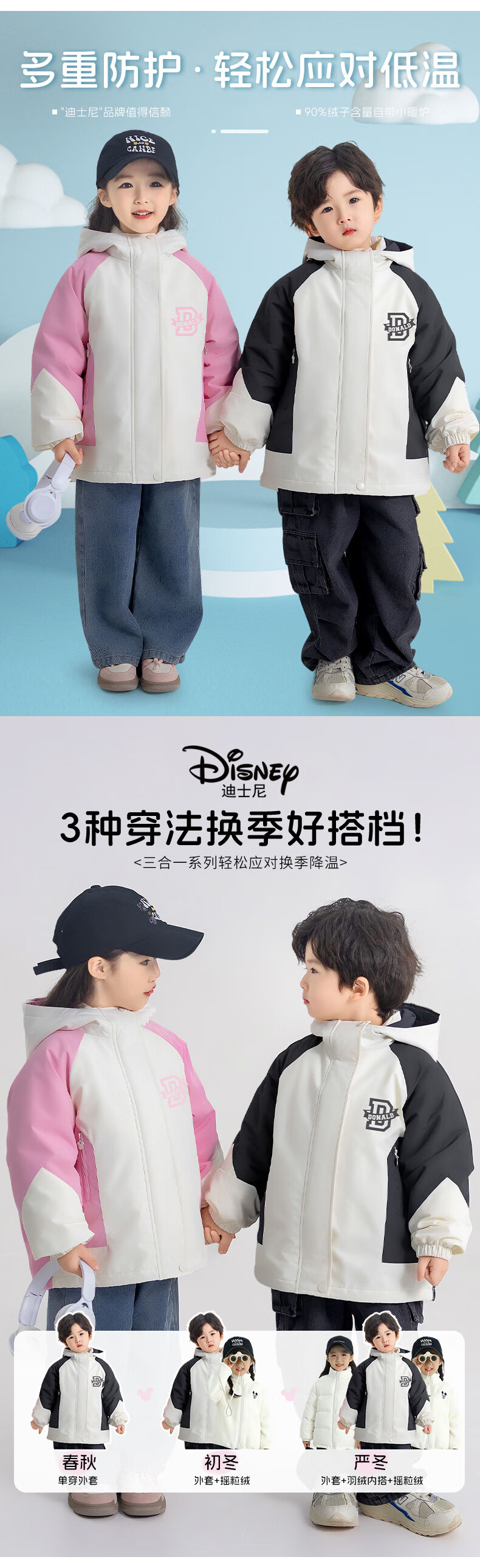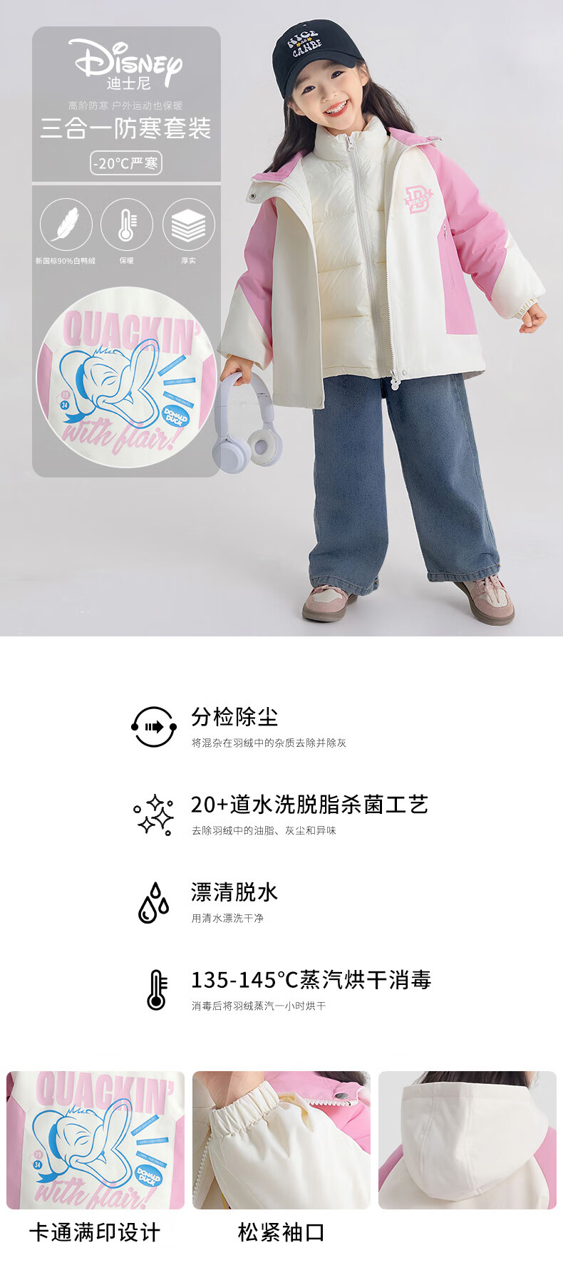 迪士尼儿童秋冬季羽绒服三件套男女童防风保暖连帽休闲外套 粉色 (三件套) 160 (80-100斤)
