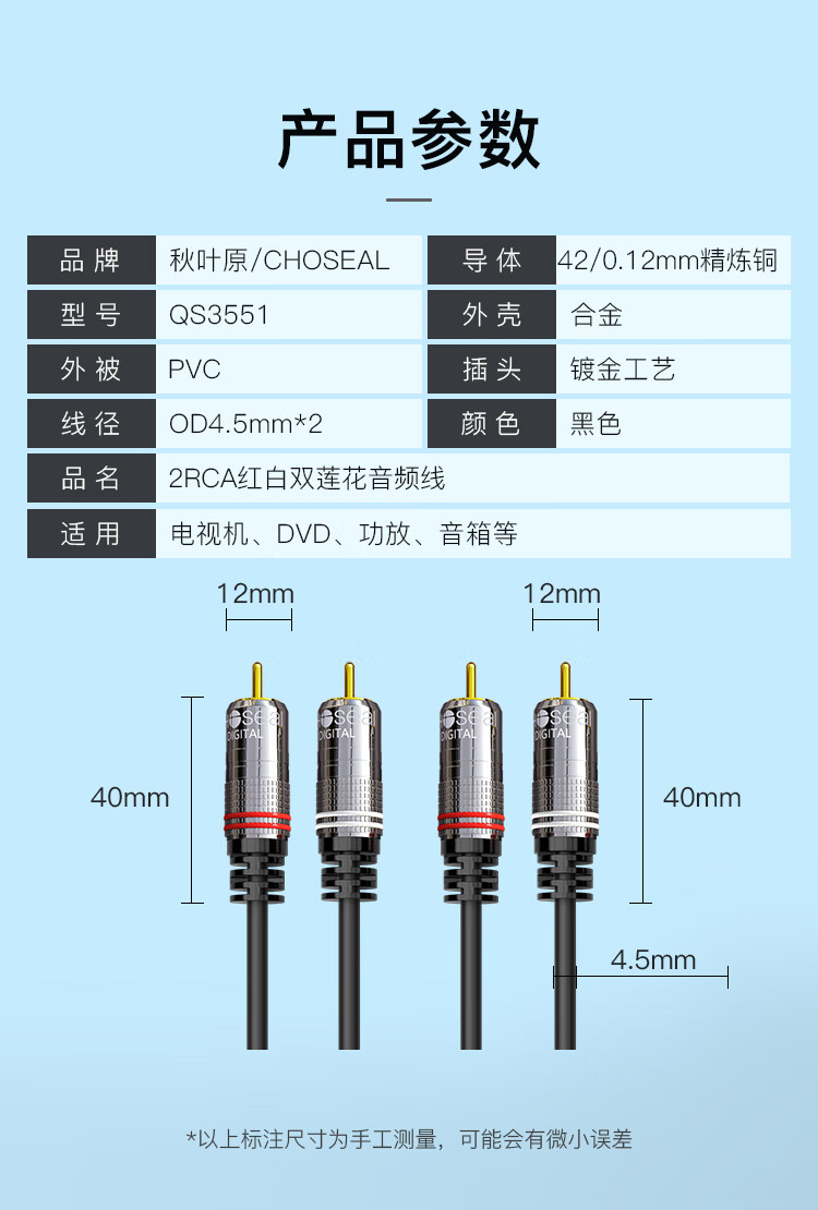 秋叶原(CHOSEAL)双莲花头音频线2RCA公对公 二对二红白AV信号 DVD电脑电视接音响功放线 1.5米 QS3551T1D5
