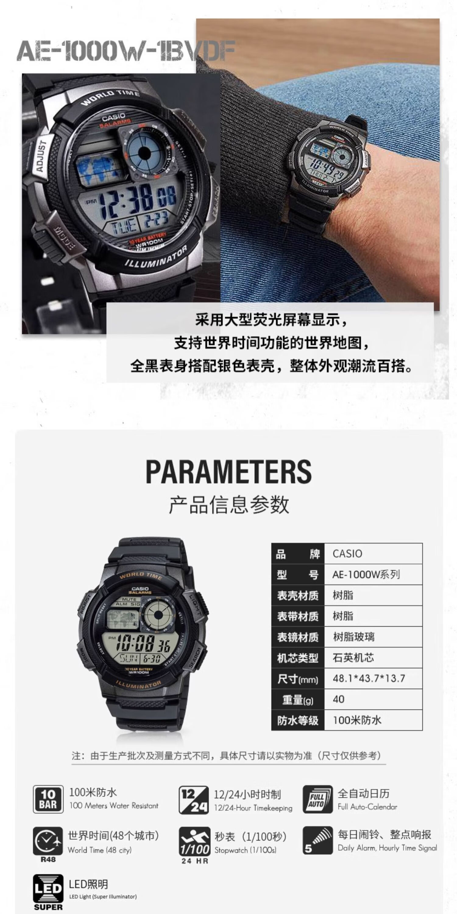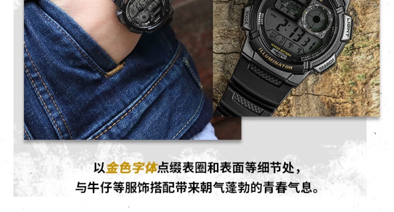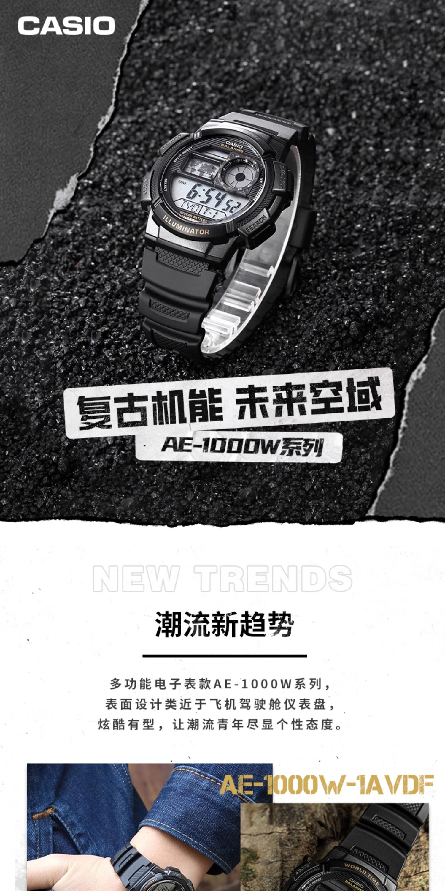 卡西欧(CASIO)男士手表 运动型初高中学生石英数字电子表防水手表 潮流腕表男表 AE-1000W-1AVDF
