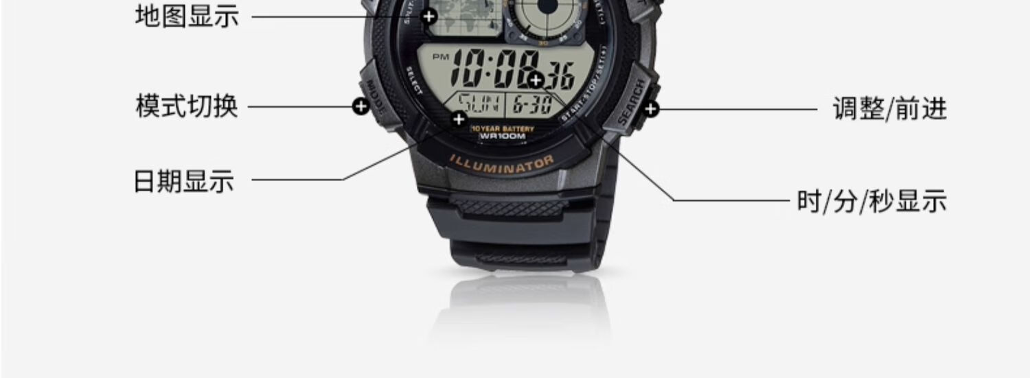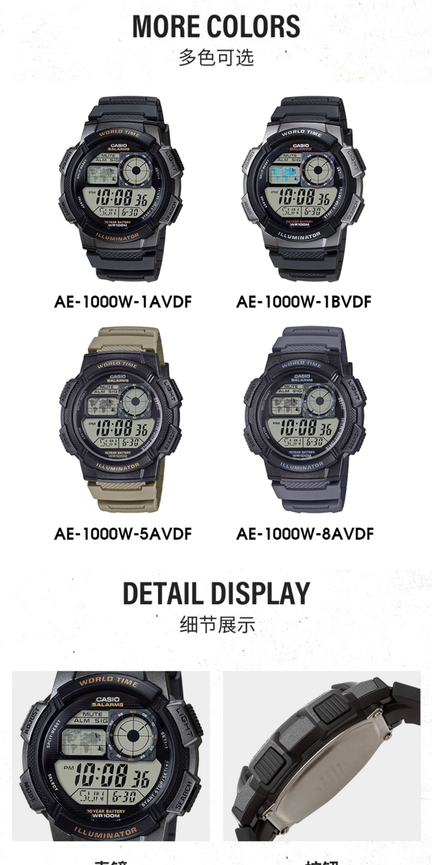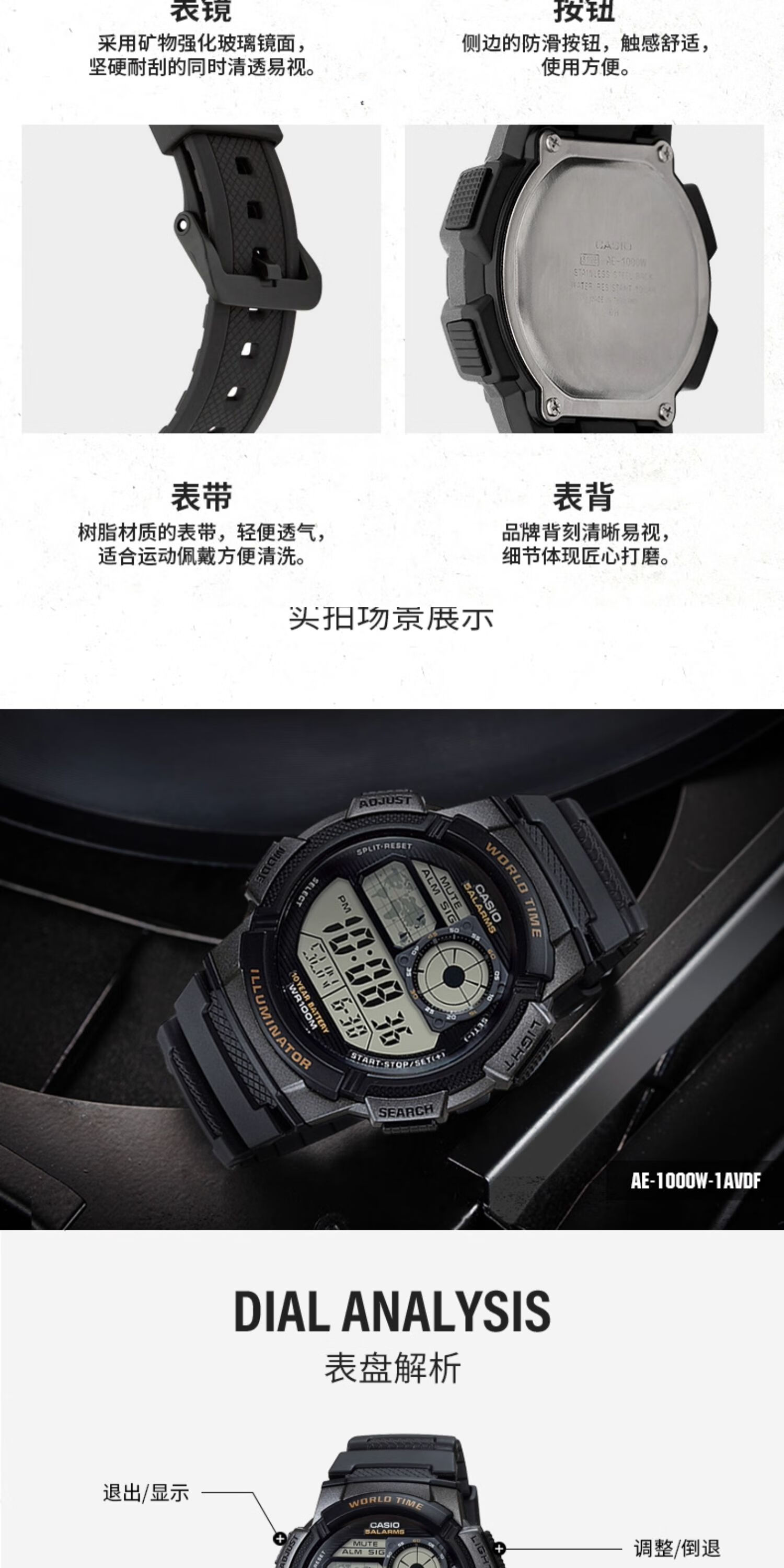 卡西欧(CASIO)男士手表 运动型初高中学生石英数字电子表防水手表 潮流腕表男表 AE-1000W-1AVDF