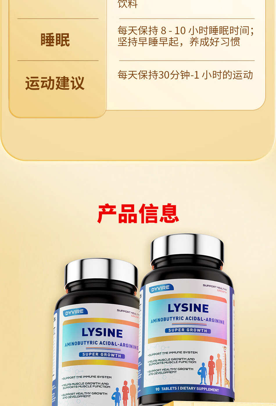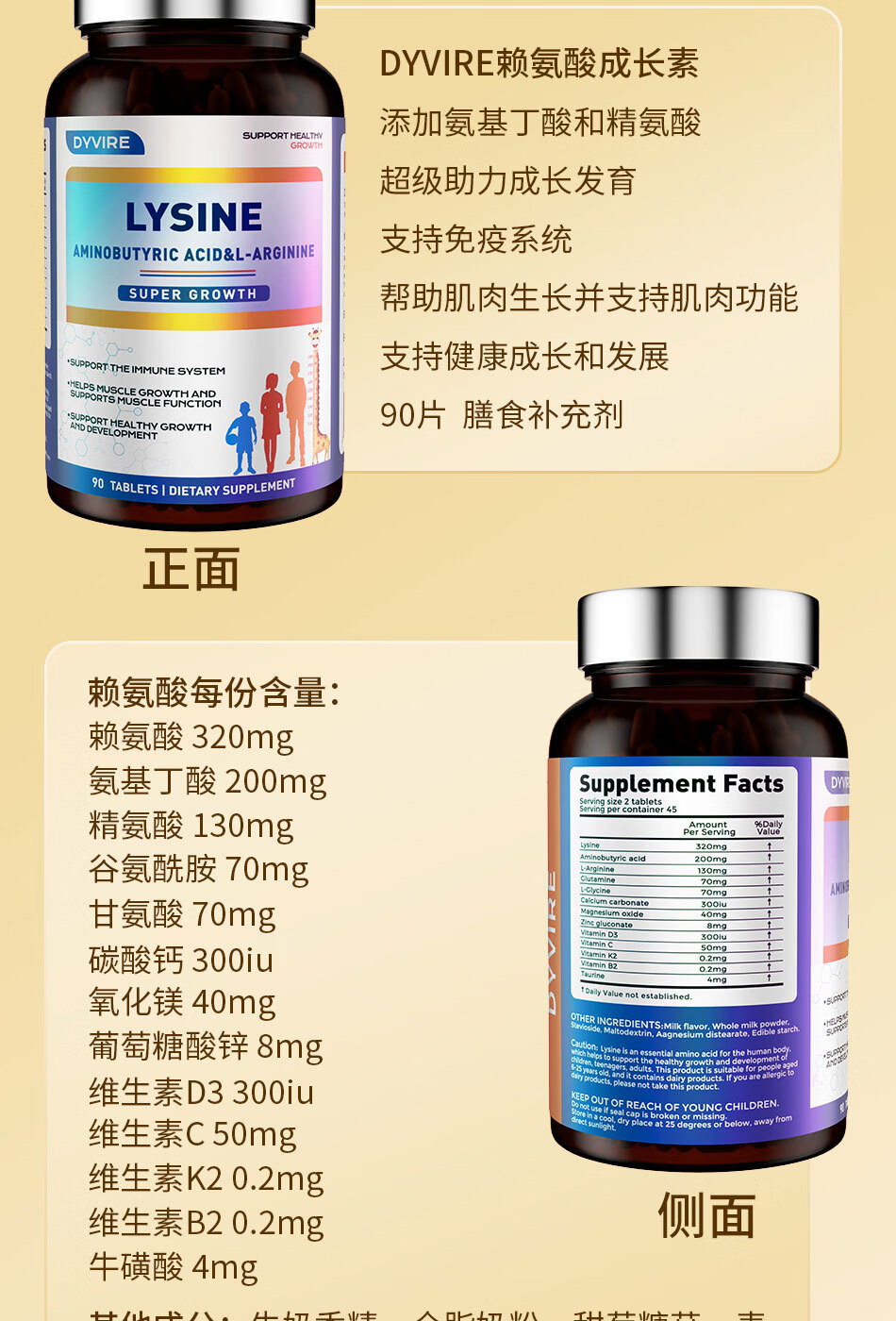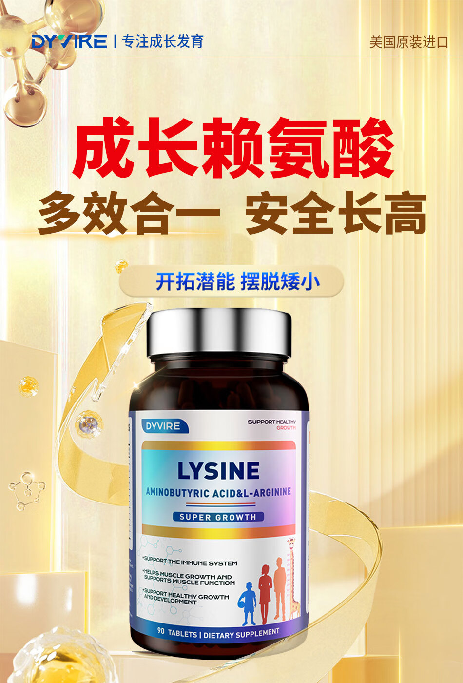 DYVIRE美国原装进口赖氨酸成长钙氨基丁酸γ生长助高 6-25岁人群适用 【90粒*1瓶 】【健康辅助长高 体验装】