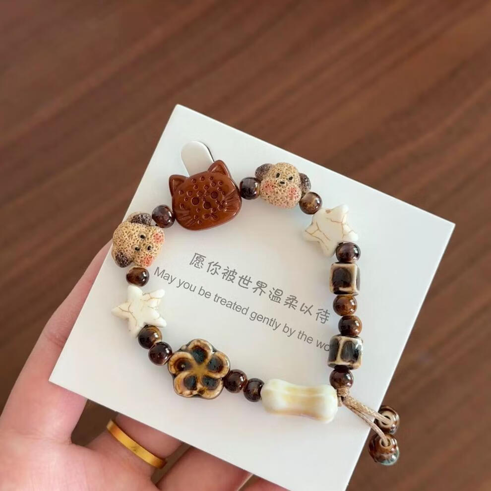 可爱小狗猫咪手链陶瓷卡通高颜值情侣闺蜜手串小众高颜值手饰礼物 咖色猫咪小狗