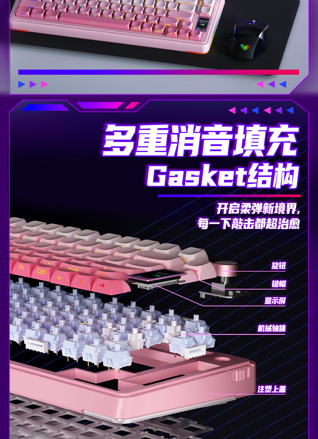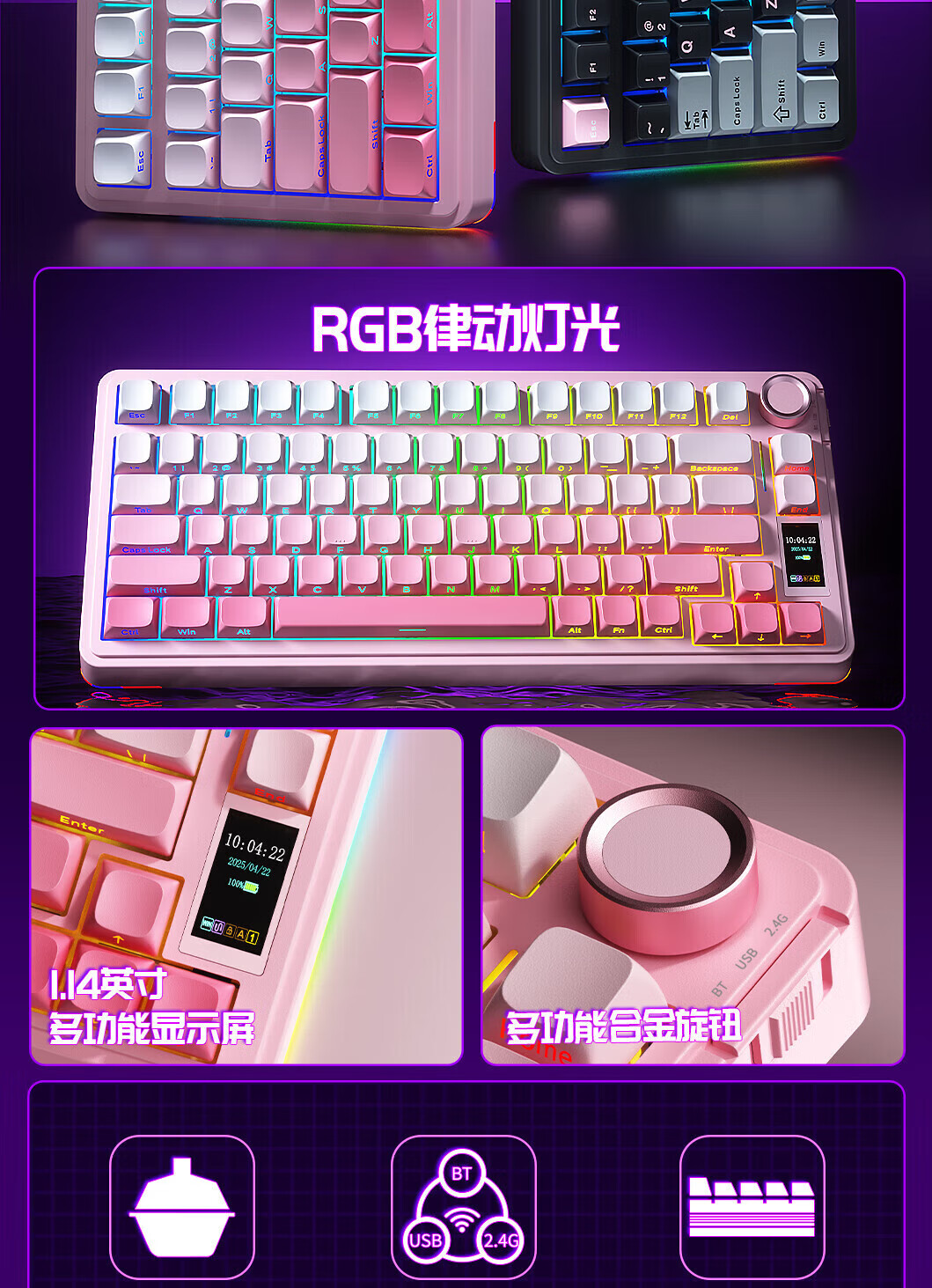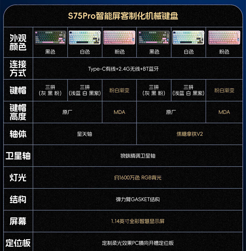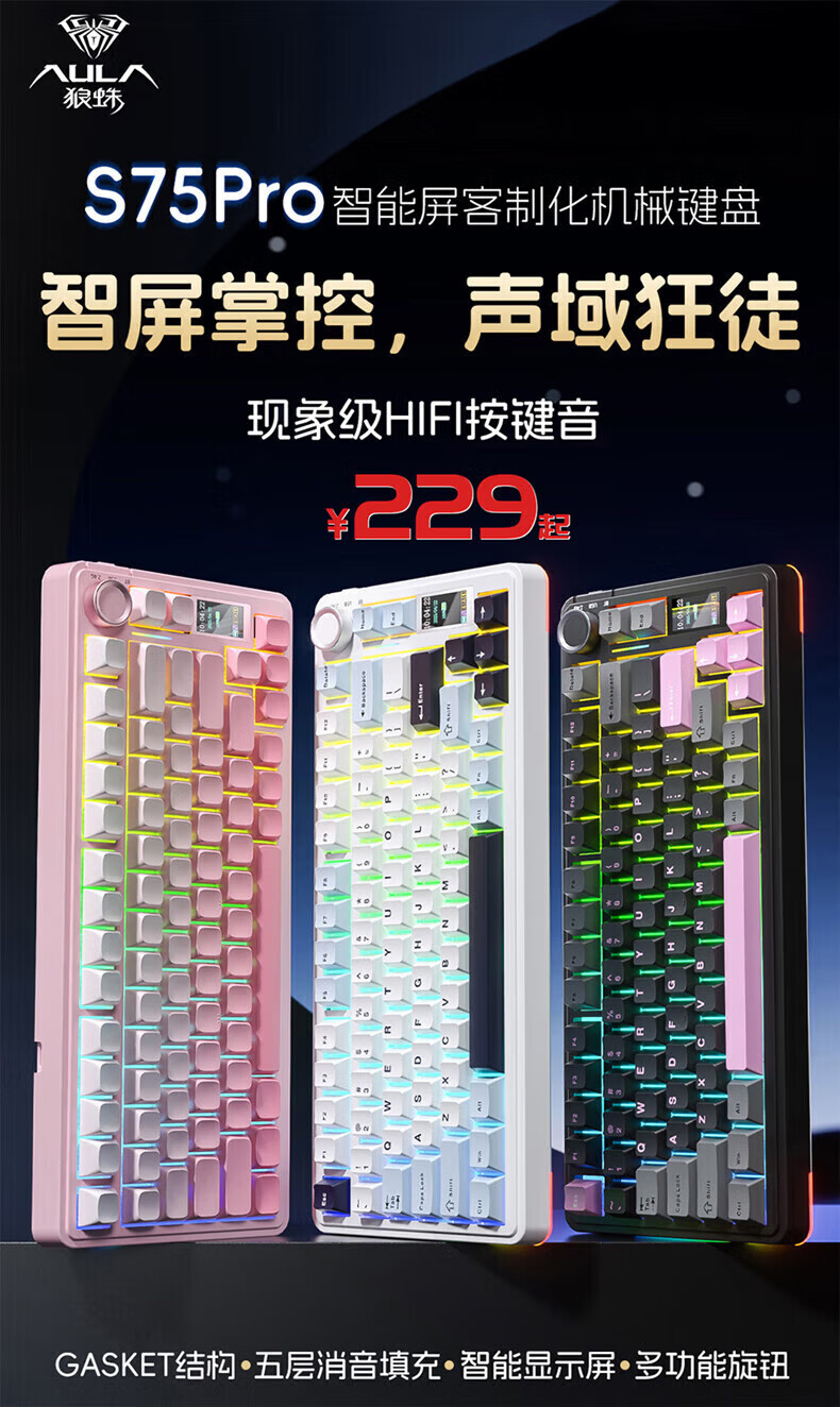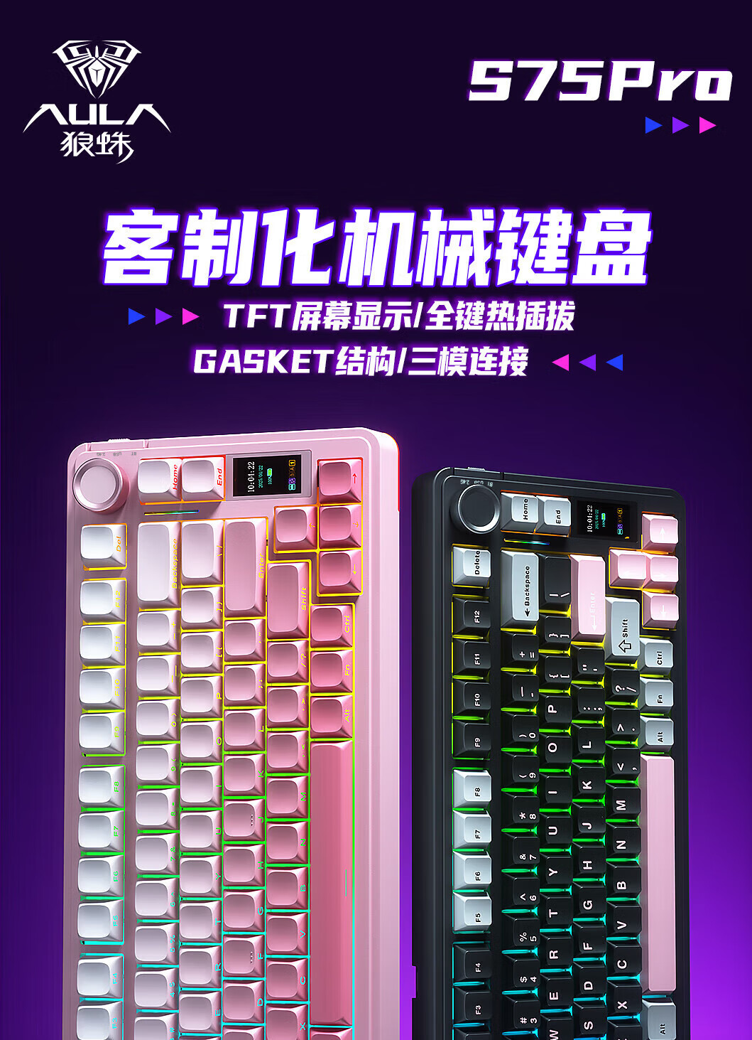 狼蛛(AULA)【顺丰】S75Pro三模机械键盘客制化等高线RGB灯光无线有线/2.4G/蓝牙连接gasket结构全键热插拔 S75Pro桃桃粉 焦糖拿铁轴V2