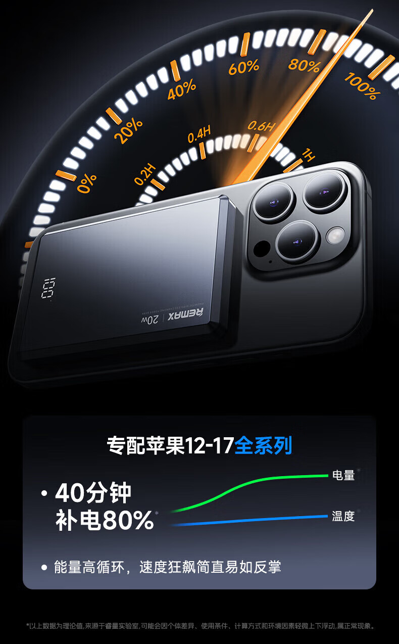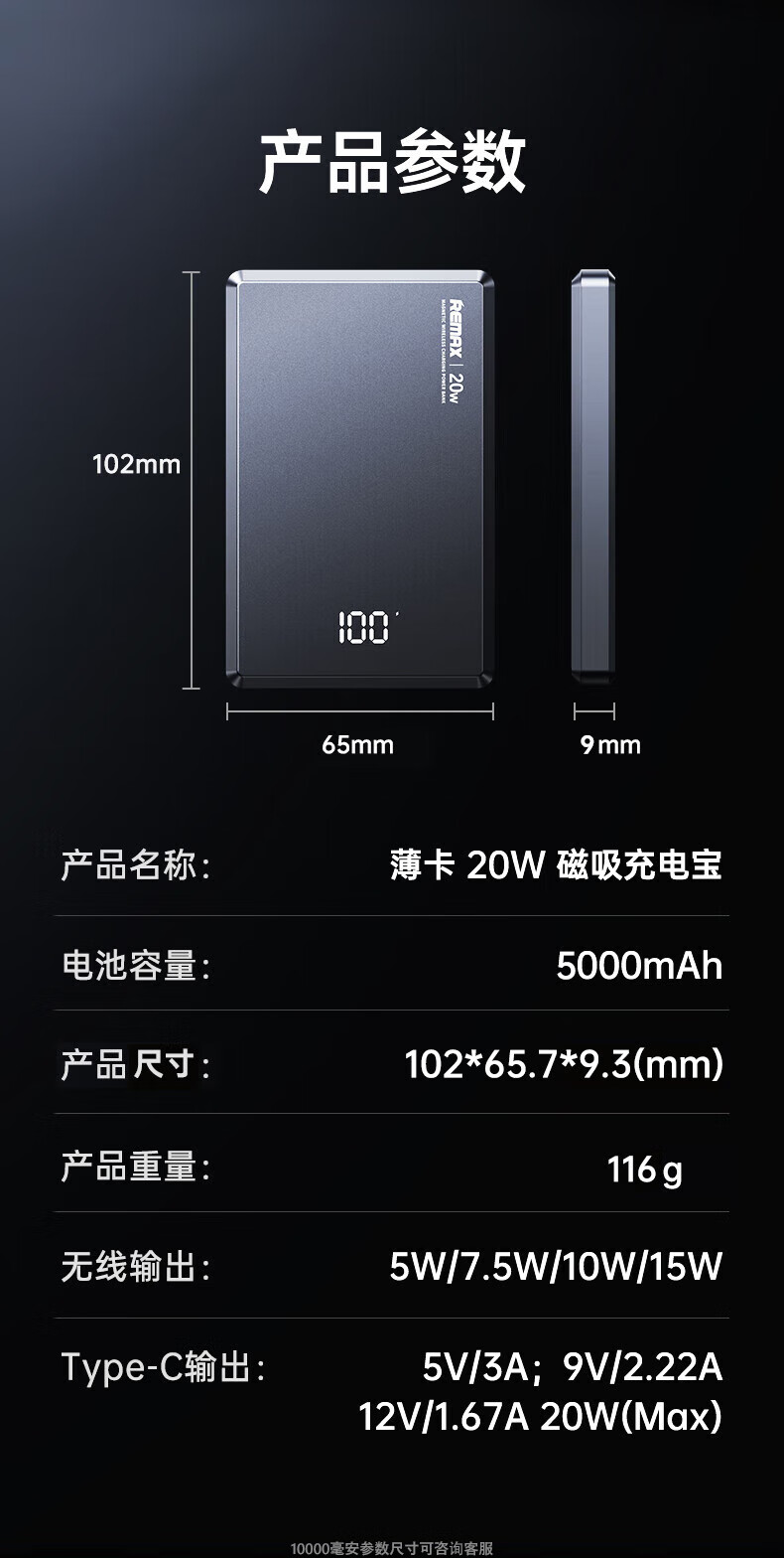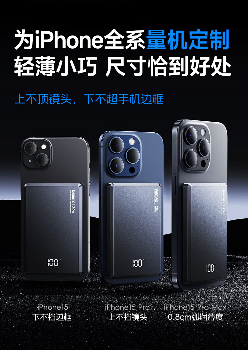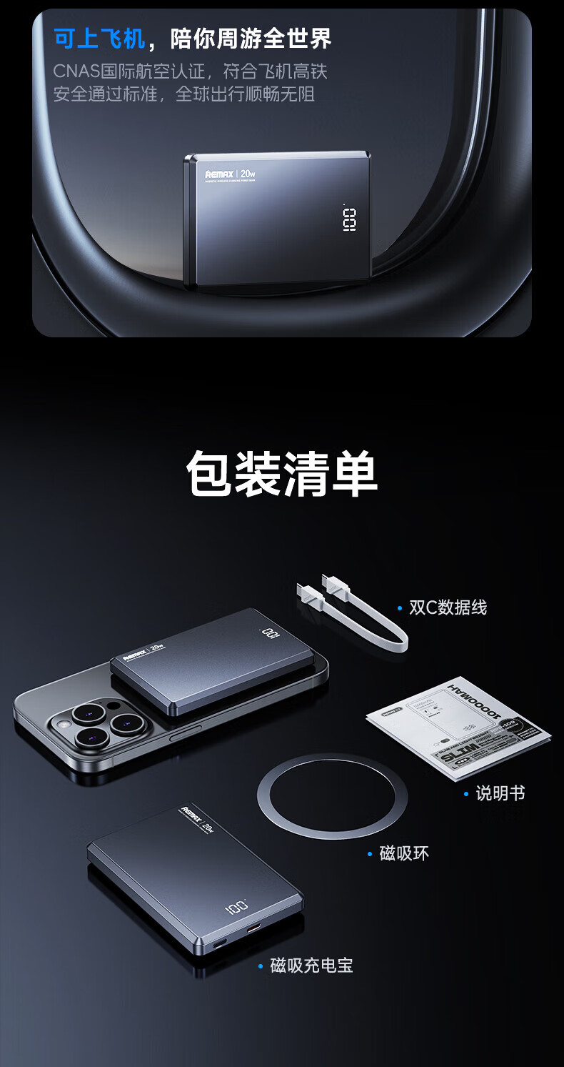 remax睿量3C认证【Magsafe外接电源】苹果磁吸充电宝10000mAh无线超薄20W快充适用iPhone16/17可上飞机