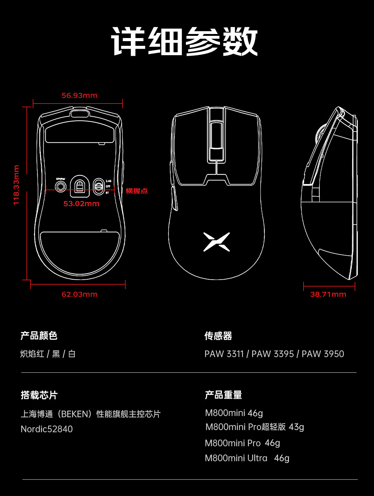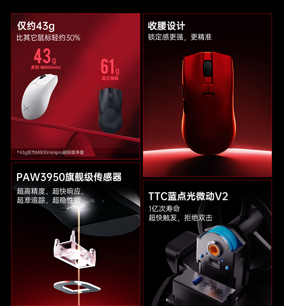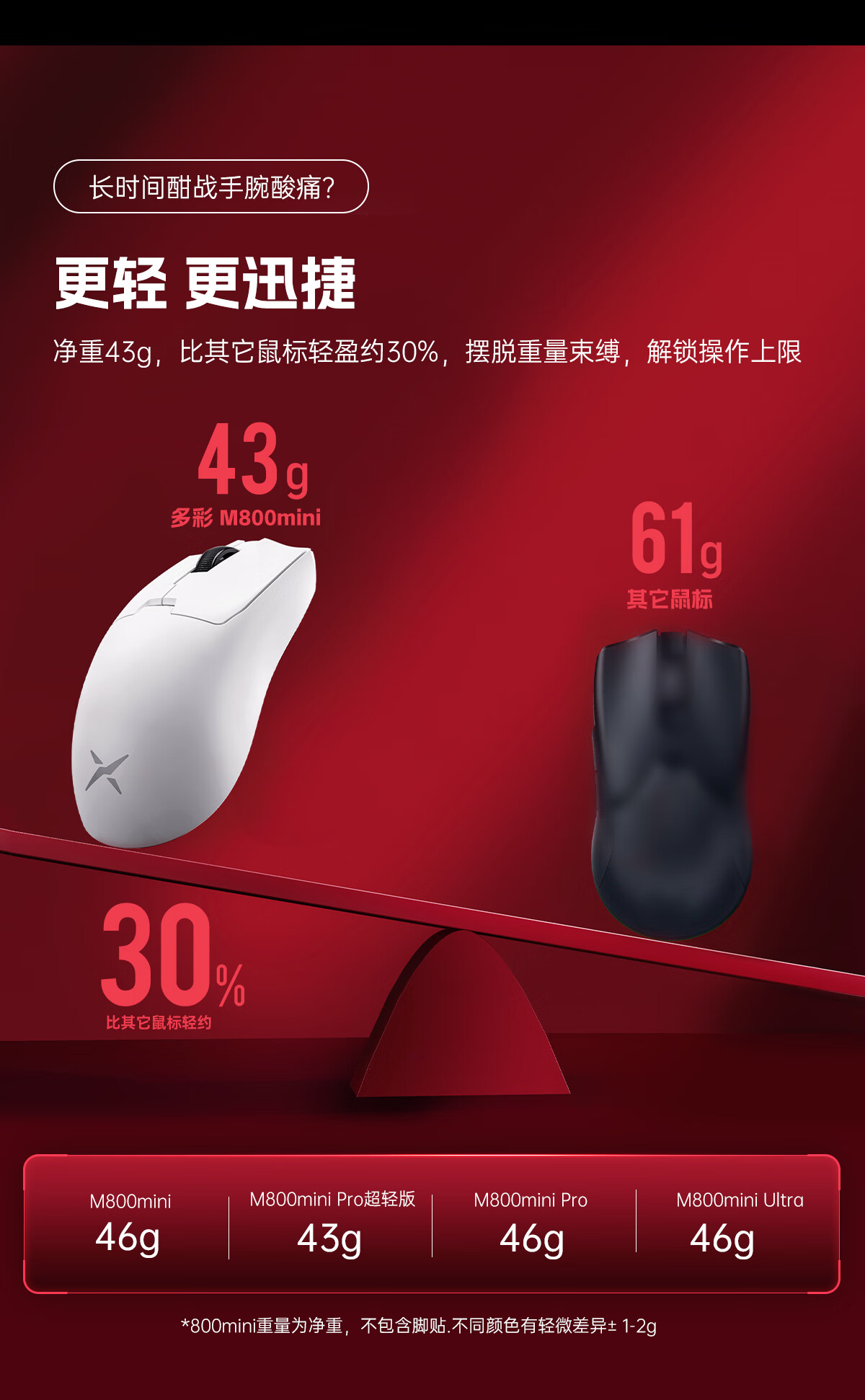 多彩(Delux)M800mini无线游戏鼠标电竞办公有线/蓝牙/2.4G三模PAW3395/3950无孔轻量化设计 M800mini Pro【3395+光微动】白